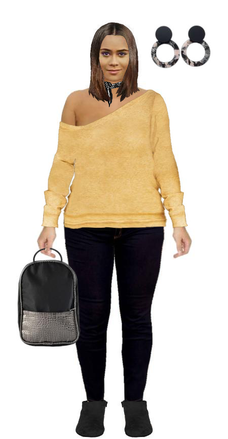 #yellow #purse #skinny #knit #sweater #backpack #black #jeans #denim #bandana